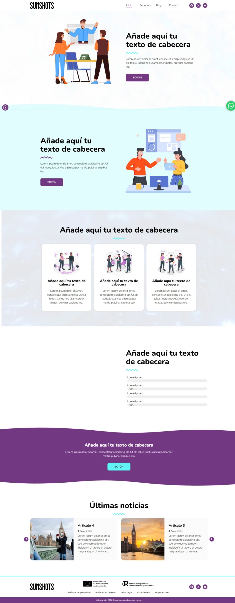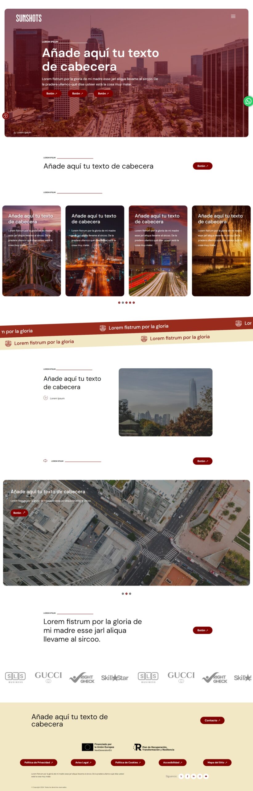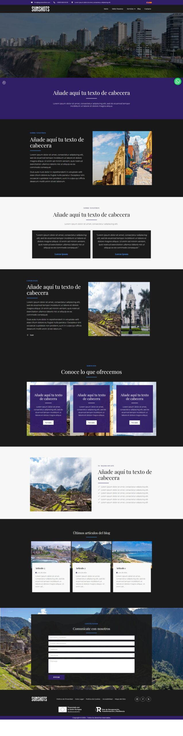 A continuación te presentamos diferentes plantillas de sitios web realizados por el equipo tecnológico de Sunshots, por favor selecciona el que más te guste para tu nuevo sitio web. Los colores, imágenes, logos y contenido los adaptaremos totalmente según tu negocio.