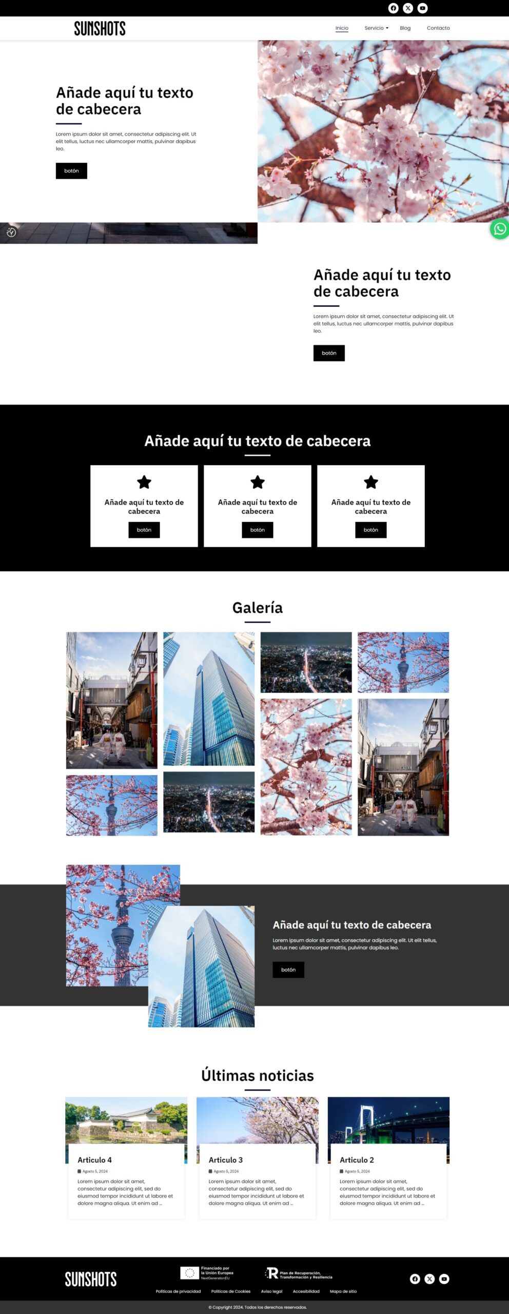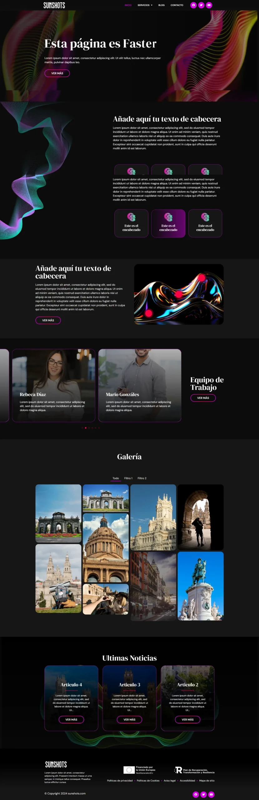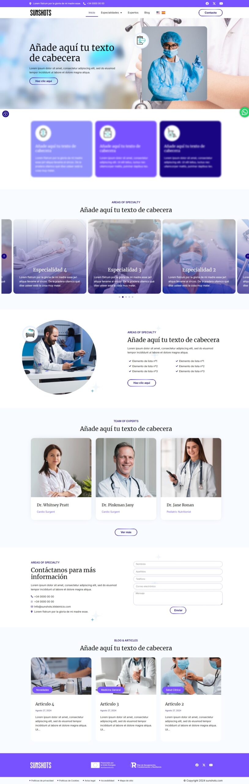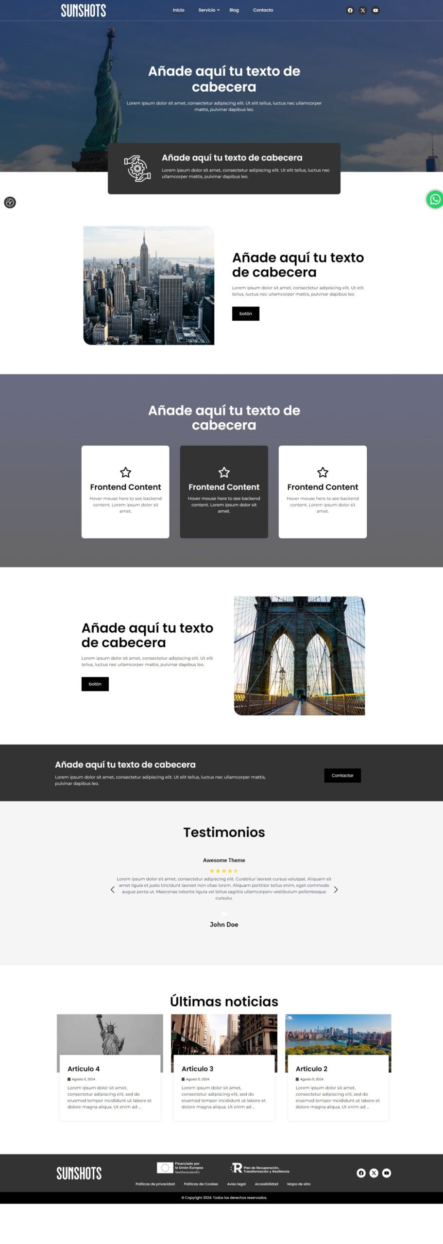 A continuación te presentamos diferentes plantillas de sitios web realizados por el equipo tecnológico de Sunshots, por favor selecciona el que más te guste para tu nuevo sitio web. Los colores, imágenes, logos y contenido los adaptaremos totalmente según tu negocio.